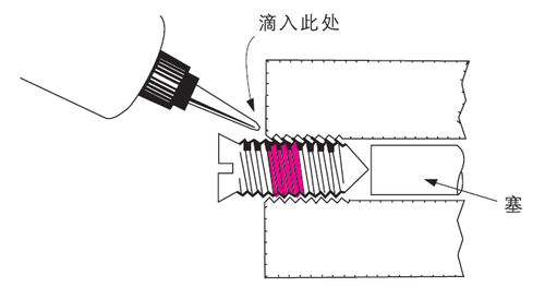 将可调螺钉调整到合适位置。滴几滴乐泰螺纹锁固剂到螺钉—螺孔结合处。不要让胶瓶的嘴碰到金属,以免污染瓶中的胶液。