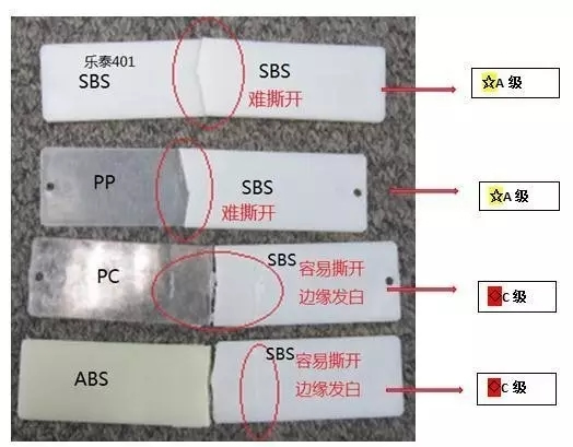 用乐泰401胶水SBS与SBS、PP、PC、ABS的粘接情况: