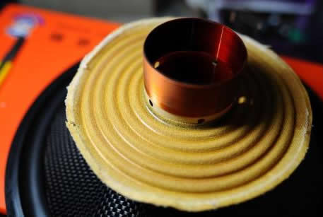 中心定位片是喇叭中最重要部件之一,现在的扬声器多是化学高分子织物做的这个支片,特性上已经很接近葛麻但是高档的HFi扬声器依旧采用葛麻制作定位片除了材料要求高,波纹的高低,形状密度曲线各项物理值皆影响音质,并不是随随便便制作的就可以的,粘接中心定位片的胶也很讲究,是织物和金属之间的粘接。