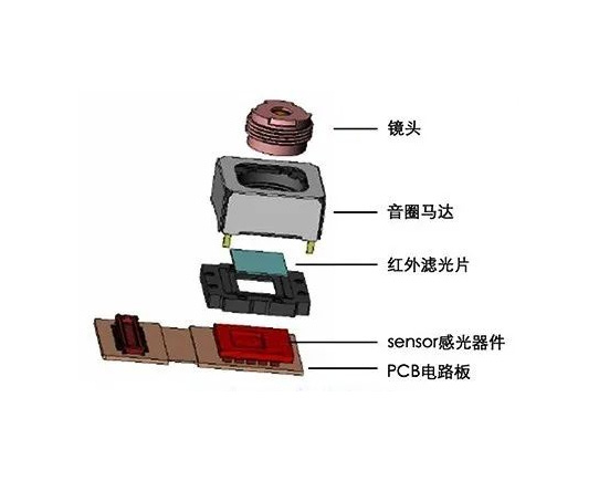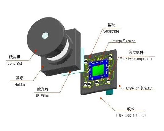 软板排线,摄像传感器/感光器件,红外滤光片,基座,镜头组,基板,音圈马达,印刷电路板等。
