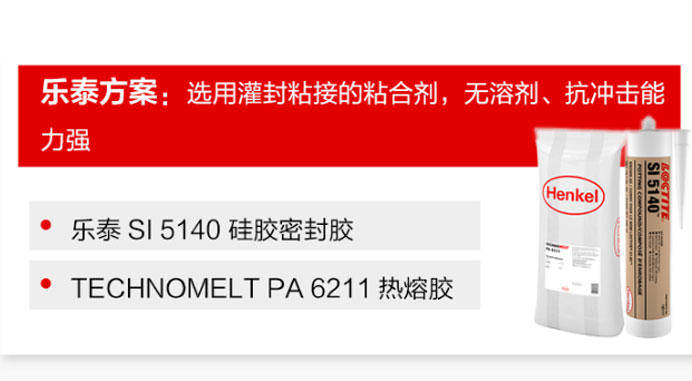 乐泰方案:选用灌封粘接的粘合剂,无溶剂、抗冲击能力强