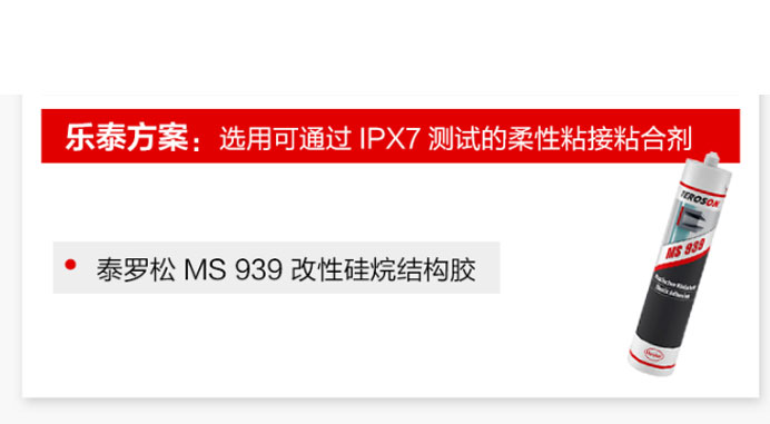 乐泰方案: 选用可通过IPX7 测试的柔性粘接粘合剂