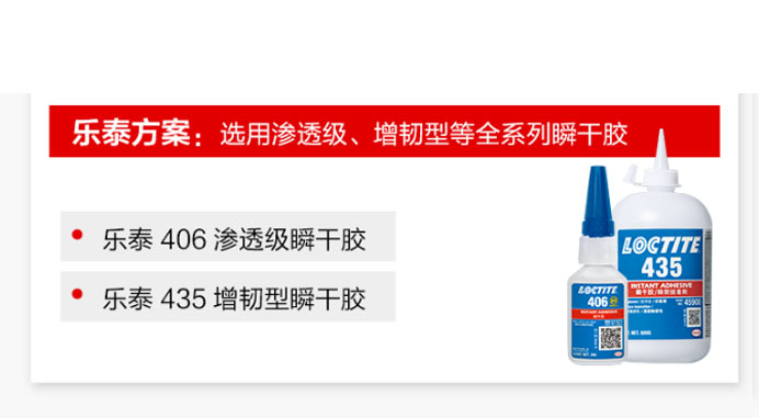 乐泰方案:选用渗透级、增韧型等全系列瞬干胶