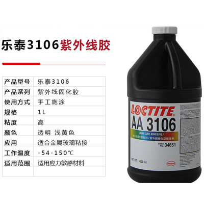 乐泰UV胶因其高透明度和出色的稳定性而成为制造商的首选,即使在潮湿和阳光直射等恶劣环境条件下也是如此。并且UV胶(紫外线光固化胶粘剂)产品用于生产玻璃器皿、玻璃家具、丙烯酸玻璃,以及也可以用于光学工业和医疗技术领域。代表产品乐泰3106、乐泰190024、乐泰9060F(UV湿气双固化)