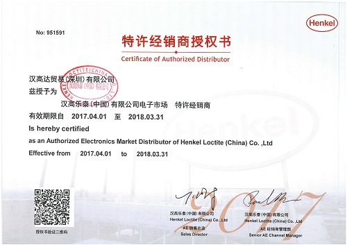 汉高达贸易(深圳)有限公司自2017年到现在已经有10多年的乐泰代理资质,涉及领域有电子粘胶剂(手持设备和显示屏)、通用工业粘胶剂(工程机械/医疗行业/装备制造)、工业粘胶剂(木工市场)、 包装和消费品粘合家具及建材市场、汉高化学技术电子市场等。