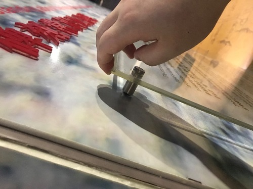 进入珠海博物馆的保密教育展馆中,有一些伟人的画像及简单介绍,在这里可以看到这些广告文字已经有脱落,对于亚克力和木板的粘接,原来使用的粘接方式不适合,长时间会失去粘力。