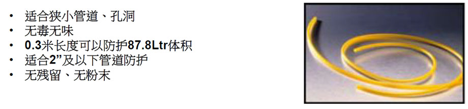 适合狭小管道、孔洞,无毒气味,0.3米长度可以防护87.8Ltr体积,适合2”及以下管道防护,无残留、无粉末