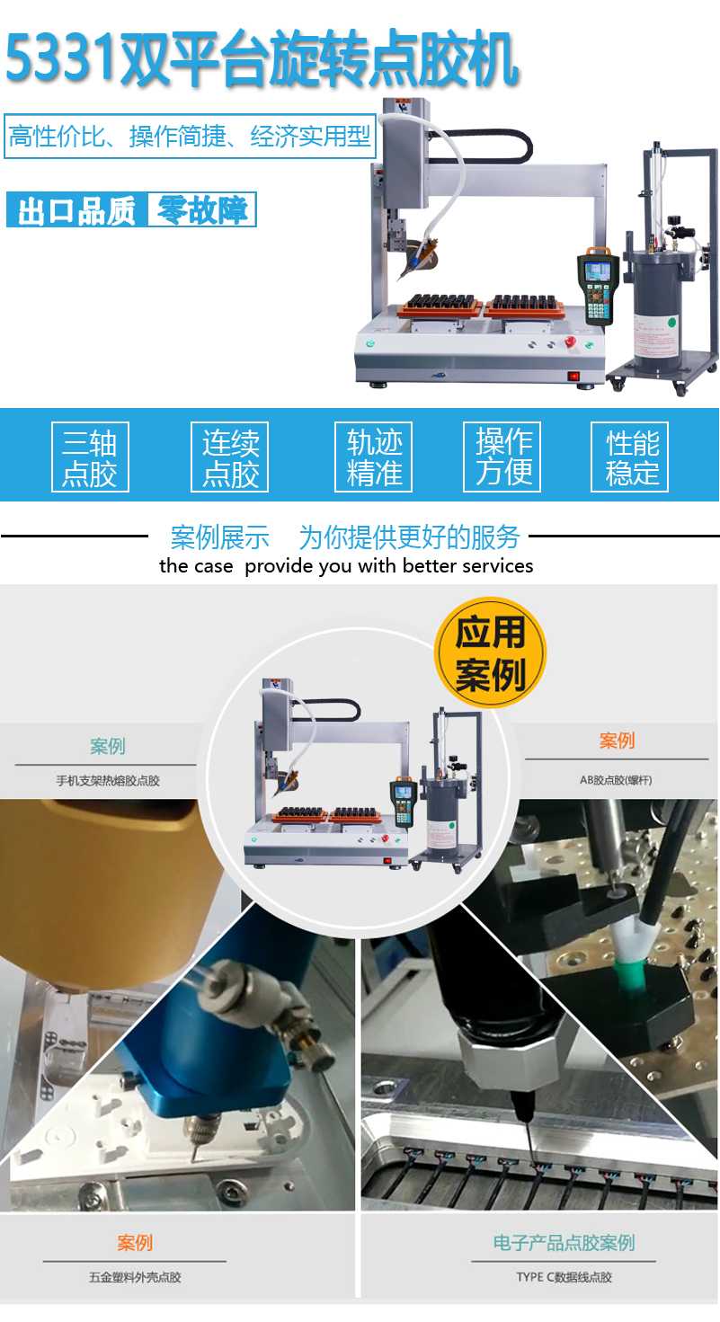 固科/Glueforce双平台自动旋转气动点胶机TZ-DJ5331R-汉高达适用于工业生产的各个领域:手机按键、开关、连接器、电脑、数码产品、电子玩具、喇叭、蜂鸣器、电子元器件、电路板、LCD液晶屏、继电器、扬声器、晶振元件、LED灯、机壳粘接、光学镜头、机械部件密封.