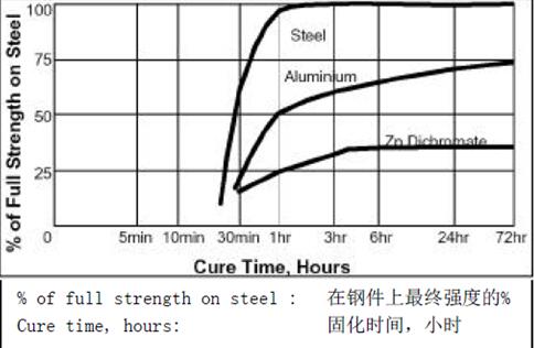 固化速度取决于被粘材料的种类。下图所示是根据ISO 10123 标准测试的。产品680 用在钢或其它材料制成的销和销套上,在不同固化时间下,所得到的剪切强度。