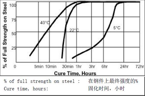固化速度因环境温度的不同而异,下图是根据ISO10123,产品680 在不同固化温度的钢制销和销套上,不同固化时间下得到的剪切强度。