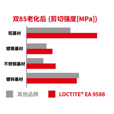 铝、镀镍和不锈钢基材上,LOCTITE EA 9588性能优于同类型环氧胶 镀锌基材上,LOCTITE EA 9588性能等同于同类型环氧胶