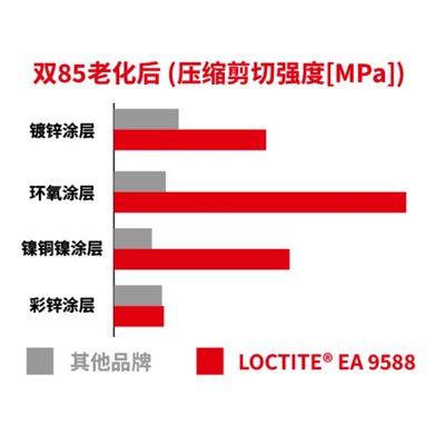 镀锌涂层、环氧涂层及镍铜镍涂层上,LOCTITE EA 9588性能优于同类型环氧胶 彩锌涂层上,LOCTITE EA9588性能等同于同类型环氧胶