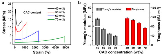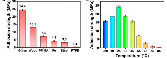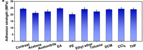 该胶黏剂产品可以粘接多种材料,尤其对玻璃的粘接强度特别高,拉伸剪切强度可以高达24MPa。对木材、PMMA、铁、不锈钢的粘接强度分别为13、7.3、4.3和3.3MPa (如下左图所示)。