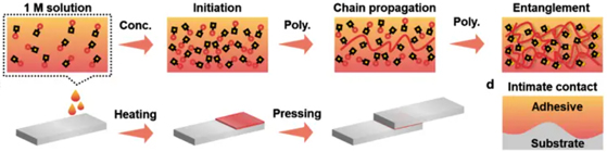 受自然粘附现象启发,此科研团队推出了一种新技术:在施胶时,用的是单体离子液体水性胶(由两种单体与水混合而成),通过热处理方式进行原位自发聚合,最终实现超强粘附效果。