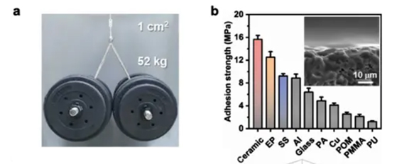 粘附性能测试显示,即使粘附面积只有1 cm²的陶瓷基底也能够轻易地悬挂起52 kg的重物,不会出现脱落。