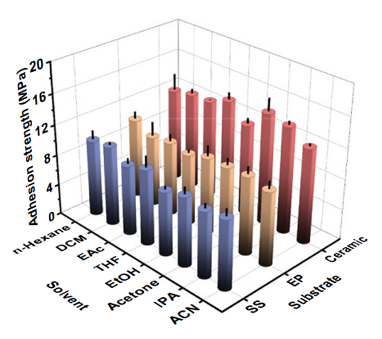 在陶瓷、环氧树脂(EP)、不锈钢(SS)和铝(Al)上的平均粘附强度分别能够达到15.6、12.5、9.8和9.0 MPa。此外,该胶粘剂固化后,还具有很好的有机溶剂耐受性,能够在多种常见的有机溶剂中持久有效。一方面,对于固化后的胶体本身,即使经过长时间(1个月)的有机溶剂浸泡,样品并未表现出明显的溶胀或溶解。